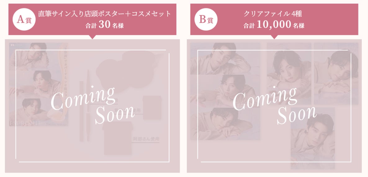 2023年8月18日(金)~9月11日(月)の期間に全国のエスプリーク商品取り扱い店舗(ECサイトを含む)にて、アクアリー スキンウェア シリーズ商品を1回あたりのお買い物で3,300円(税込)以上ご購入いただいたお客さまを対象に、レシート画像や購入明細をキャンペーンサイト上にアップロードし、応募いただくと、抽選で約1万名様にエスプリーク×人気俳優スペシャルタイアップの直筆サイン入りポスターやオリジナルクリアファイルをプレゼントします。