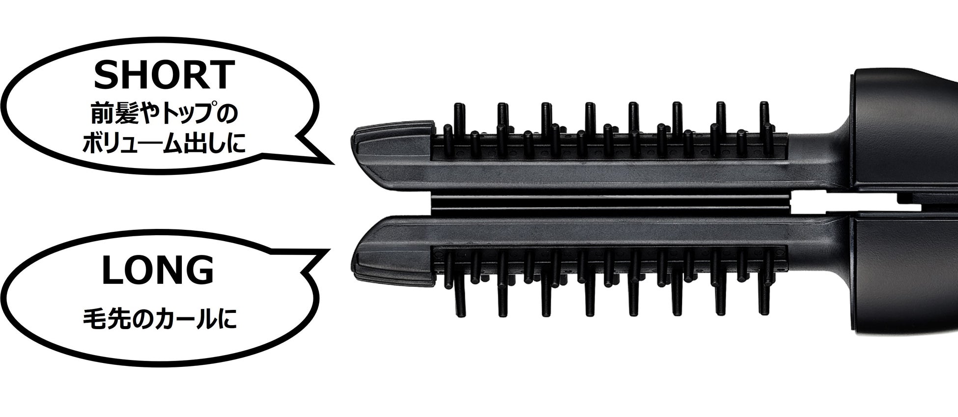 短いブラシは、前髪のスタイリングやトップのボリューム出しに。長いブラシは毛先のカールに。扇形に配置されたラウンド構造のブラシが、根もとから毛束をしっかりキャッチし、髪を立ち上げやボリュームアップを叶えます。いずれのブラシも、長さの異なるコームを交互に配置したランダムコーム。髪への引っ掛かりを低減し、過度な摩擦によるダメージを防ぎます。