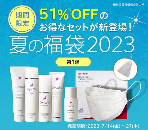株式会社SHARP COCORO LIFE(本社:大阪府八尾市、代表取締役社長:牧野哲也)は、医薬部外品のスキンケアアイテム「薬用Crystaliq(クリスタリーク)」全シリーズがセットになって半額で購入いただける『夏の福袋2023』を、本日7月14日(金)より当社ECサイト「COCORO STORE」で販売します。