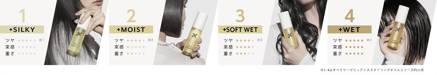 『リーゼ ニュアンススタイリングオイル』はつけた瞬間から夕方までサロン仕上げのニュアンスがつづく、髪の“質感”にこだわったヘアオイル。“+SILKY”“+MOIST”“+SOFT WET”“+WET”の4つから、なりたい仕上がりを選ぶことができます。