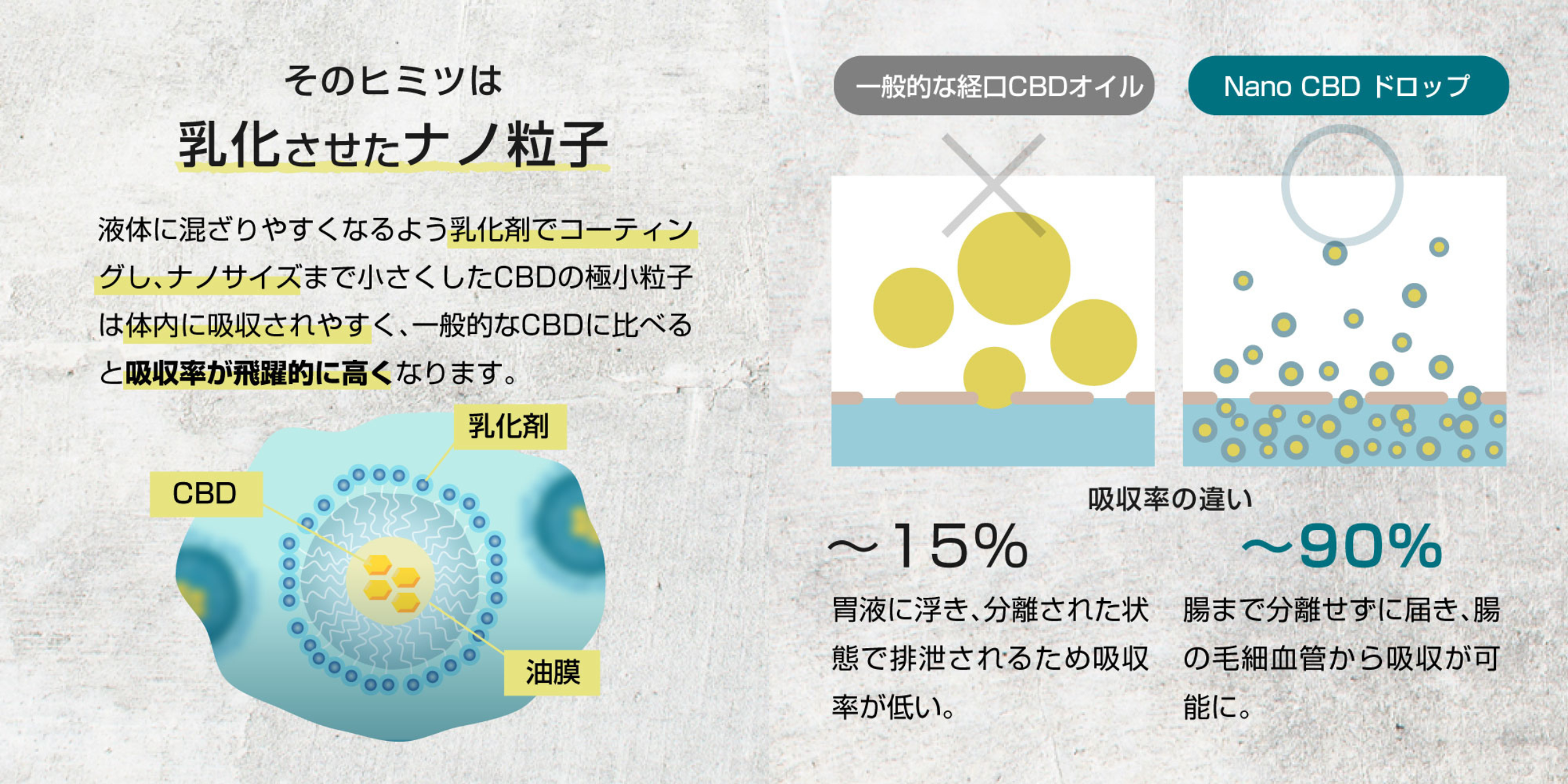 「JOODAN CHILLING HAZY IPA」には、JOODANのナノCBDが20mg配合!ナノCBDは、一般的なCBD原料の粒子を、製薬技術の研究に基づいた特殊技術で【5000倍】細かくナノ化。粒子サイズが小さいことから体内吸収率が高く、そのため速効性があるのが特徴です。また、サイズが小さいこととあわせ、水にも混ざるように特殊に加工していることにより、ドリンクに瞬時に混ざるのも特徴です。