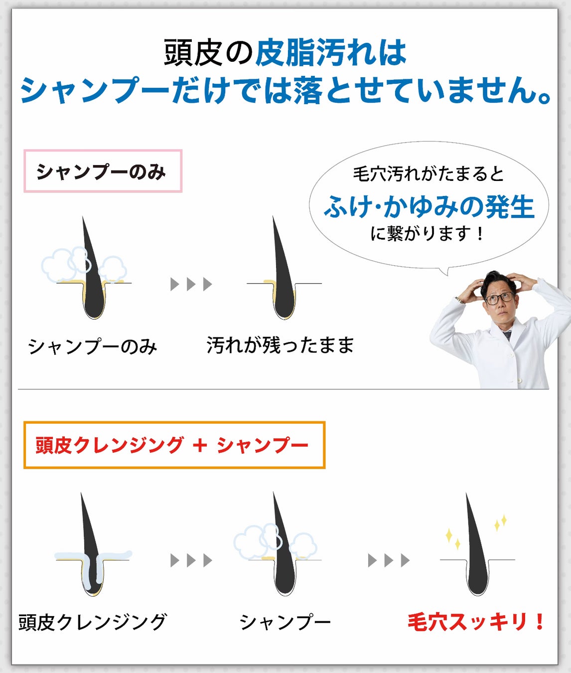 その中で、薄毛の要因は頭皮の汚れ、脂の詰まりなどから来るものが大きくシャンプーでは洗い切れない汚れも多いことから、”頭皮の清潔”を保つ点に特化したものが必要であるという点から頭皮クレンジングは開発されました。