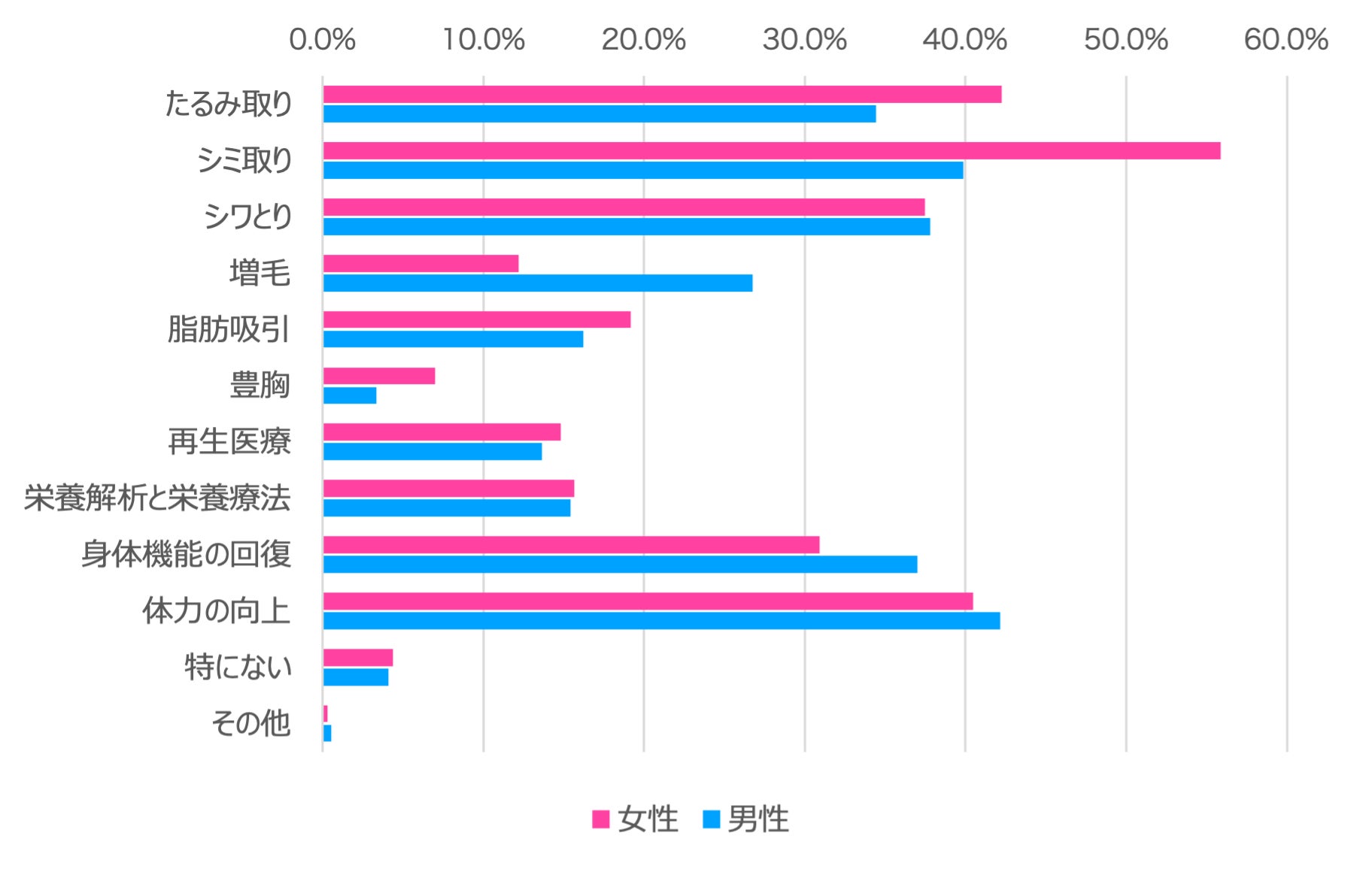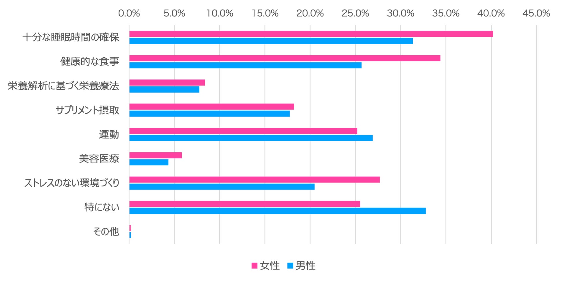 次に、若返り(美容)のために取り組んでいることを聞いたところ、男女ともにトップは「十分な睡眠時間の確保(女性:40.2%、男性:31.4%)となりました。つづいて高かったのは、女性「健康的な食事(34.4%)」、男性「特になし(32.8%)」でした。