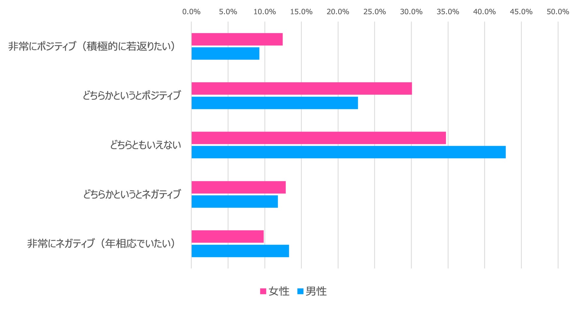 年代別に見ると、「非常にポジティブ(積極的に若返りたい)」と「どちらかというとポジティブ」を合わせた「ポジティブ」層は、女性が30代で最も高く約半数の48.4%、最も低い20代でも38.4%、男性で最も高いのは40代で34.8%、最も低いのは30代と50代で29.2%でした。