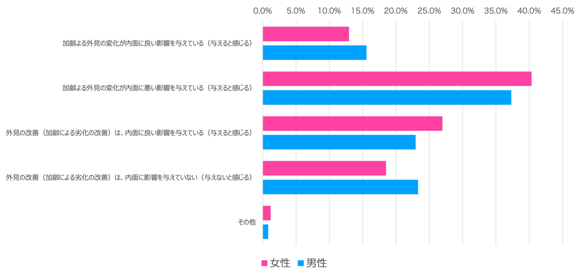 男女ともに「加齢による外見の変化は内面に悪い影響を与えている」が「良い影響を与えている」を上回る。 一方、外見の改善は、特に女性にとって内面に良い影響を与える。