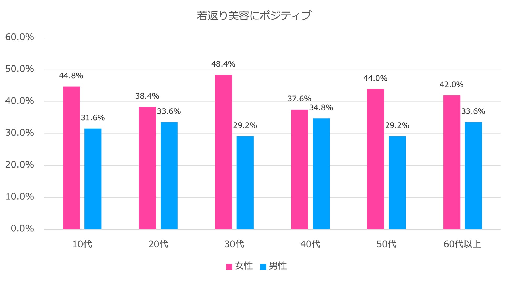 女性平均42.5%、男性平均32.0%が若返り美容についてポジティブ