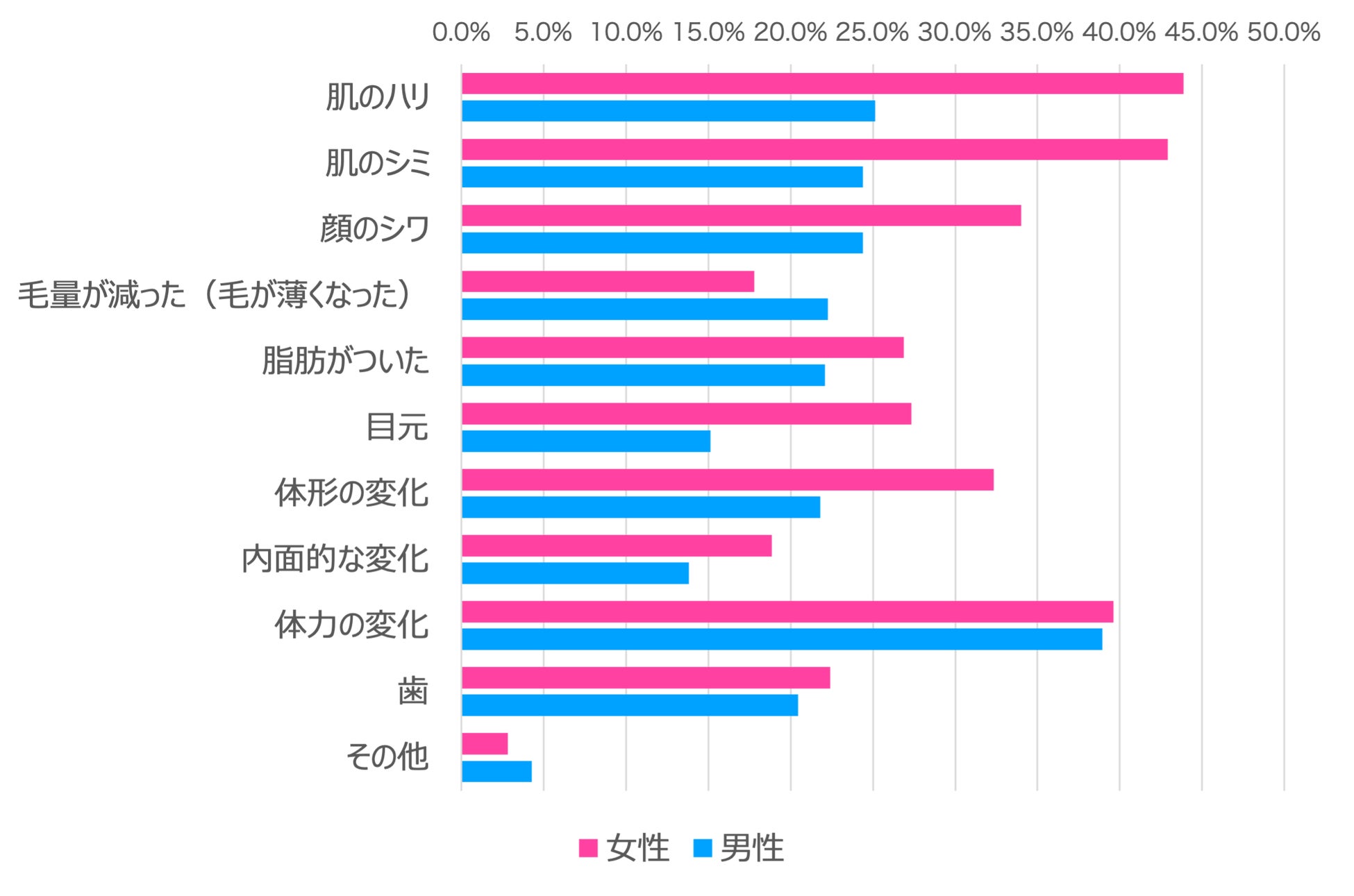 つづいて、歳を重ねたことによる自身の身体の変化について聞いたところ、女性は「肌の変化」を大きく感じていることがわかりました。一方男性が一番感じているのは「体力の変化」という結果でした。