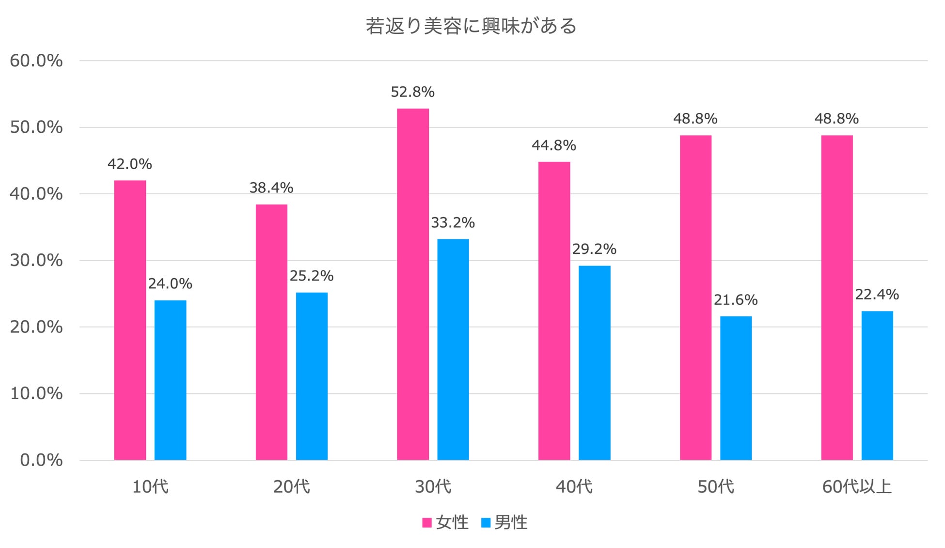 若返り美容への興味が30〜60代で常に高い女性に対し、男性は年齢が高くなるほど興味薄れる