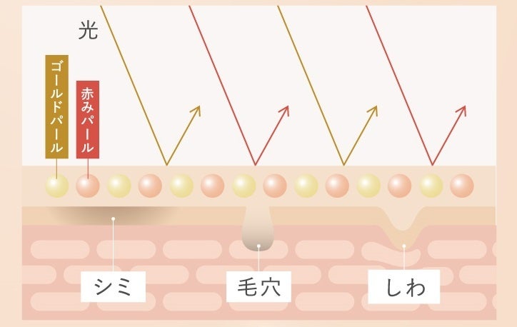 シミやそばかすの茶色味を隠してくれる赤みパール[*9]と赤シミを隠してくれるゴールドパール[*9]の2色のパールを独自ブレンドした「スポットブレンドフィルター」により、色と光の反射を使い厚塗り感を出さずにシミをカバーします。