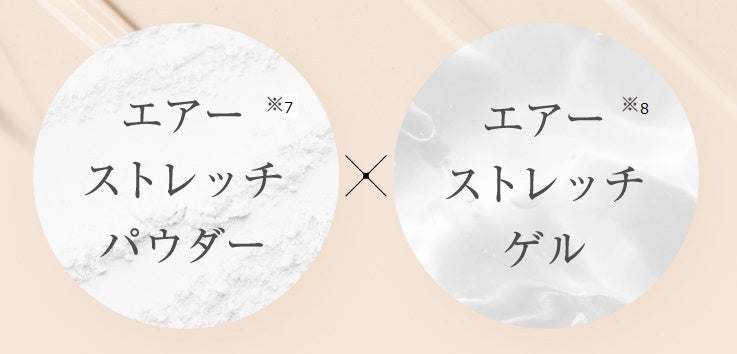 サラサラ感をキープするエアーストレッチパウダー[*7]と薄い高密着の膜をつくるエアーストレッチゲル[*8]を組み合わせた「エアーストレッチフィット処方」で崩れにくいなめらかな肌に仕上げます。