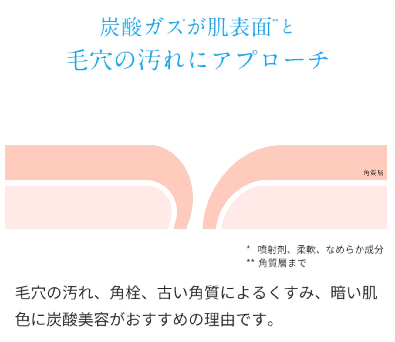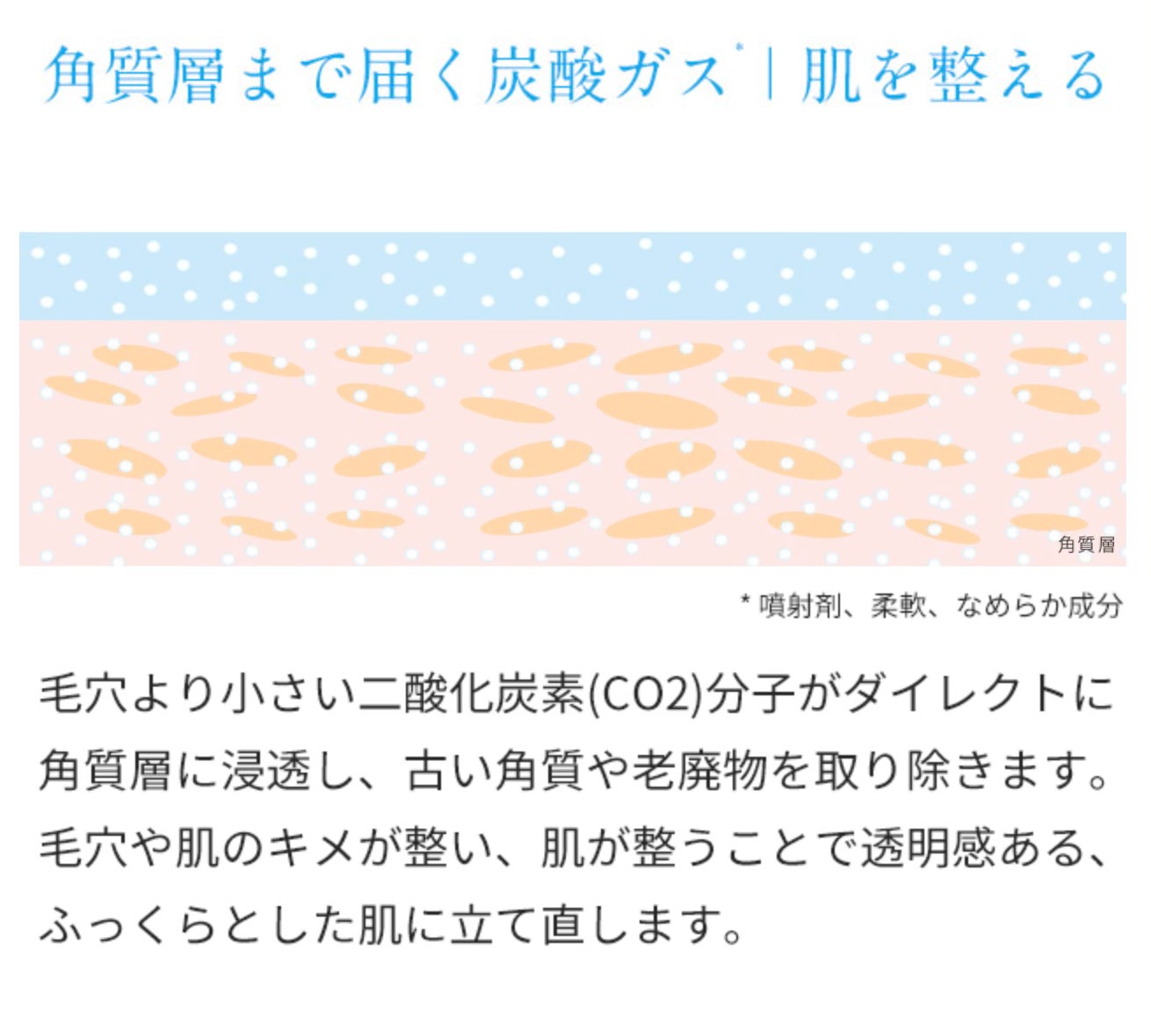 炭酸スキンケアは、肌の表面を整えるだけではありません。毛穴より小さい二酸化炭素(CO2)分子がダイレクトに角質層に浸透し、古い角質や老廃物を取り除きます。毛穴や肌のキメが整い、肌が整うことで透明感アップし、ふっくらとした肌へとサポートします。