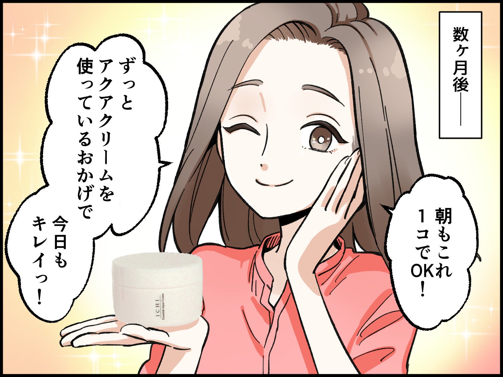 アクアクリーム、使い心地がとてもいいです。暑い時期もべたつきを感じることなく、程よくしっとりさせてくれます。乾燥が気になるときは、いつもよりたっぷりのせて、一年中、朝晩これ1つだけです。