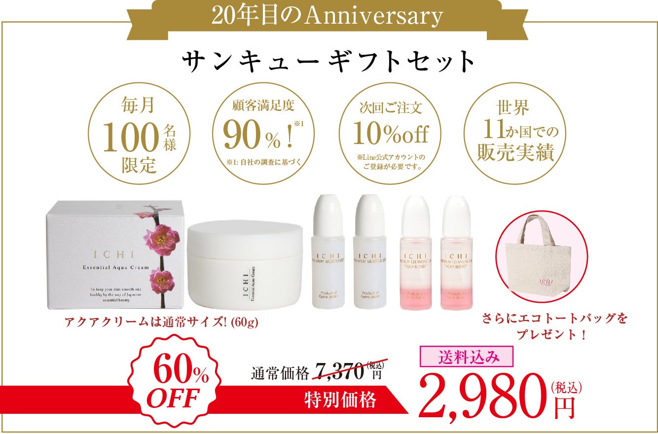 その後、ICHI化粧品は世界11ヶ国で販売実績を上げましたが、日本国内ではまだまだ知名度が低く、特に敏感肌や肌トラブルでお悩みのお客様に毎日気軽に使って頂きたいと、一番人気の美容クリーム、クレンジング、化粧水がセットになったサンキューギフトセットを発売しました。