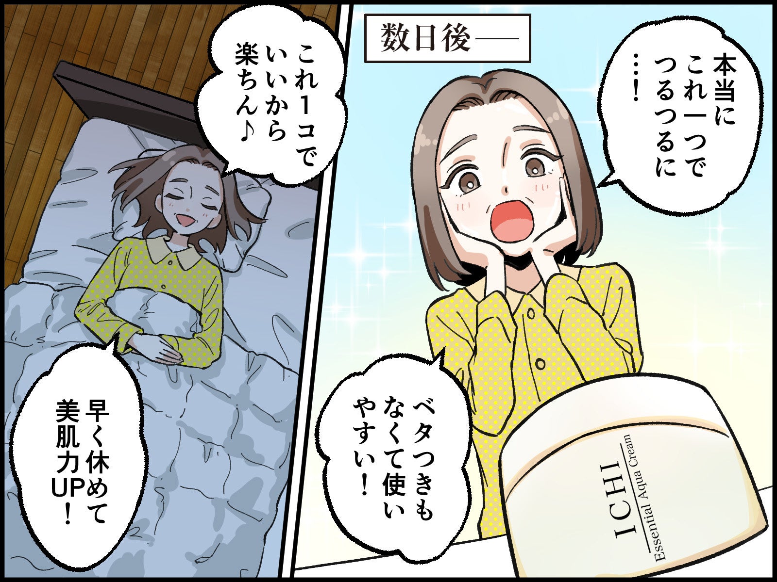 試供品を以前使った際によかったなという印象があり購入しました。やはり、普段のケアより朝起きた際の顔のテカリが軽減されていました。楽チンなのに肌にしっかりときいてくれるので嬉しいです。