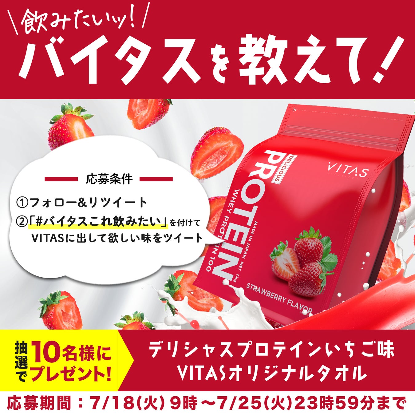 キャンペーン実施期間にVITAS公式Twitterアカウントをフォロー&キャンペーンツイートをリツイート。リツイート後に指定のハッシュタグと「VITASのプロテインで飲んでみたい味」をTwitterに投稿した方の中から抽選で10名に、7月7日(金)発売の新商品「DELICIOUS PROTEIN ストロベリー風味」とVITASオリジナルタオルをプレゼントいたします。