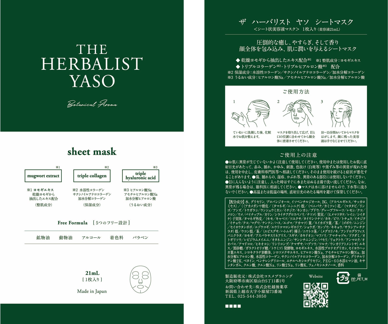 また併せて、8月1日より『越後薬草蒸留所 CRAFT GIN STAND』とTHE HERBALIST YASOオンラインショップで販売を開始する「ザ ハーバリスト ヤソ シートマスク」を期間中にご来店いただいた全ての方にプレゼントします。THE HERBALIST YASO の香りがたっぷり詰まった顔用シートマスクをぜひお楽しみください。