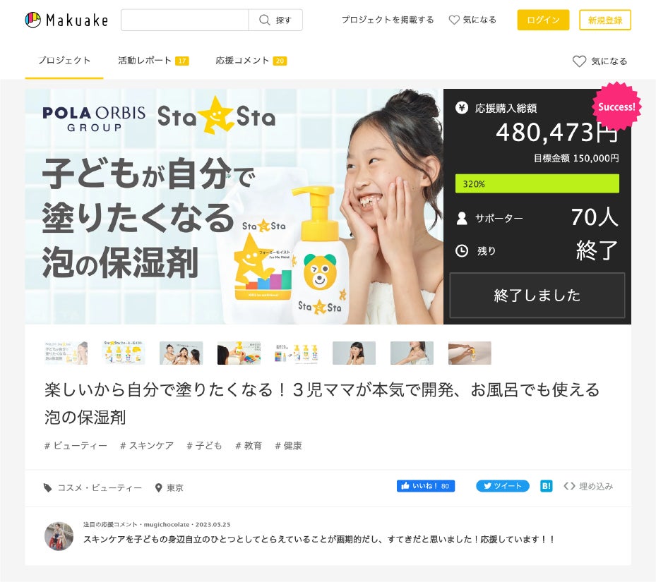 結果、プロジェクト公開初日に目標金額を達成し、プロジェクト期間終了時には目標金額の3.2倍となる480,473円の応援購入金額を達成しました。