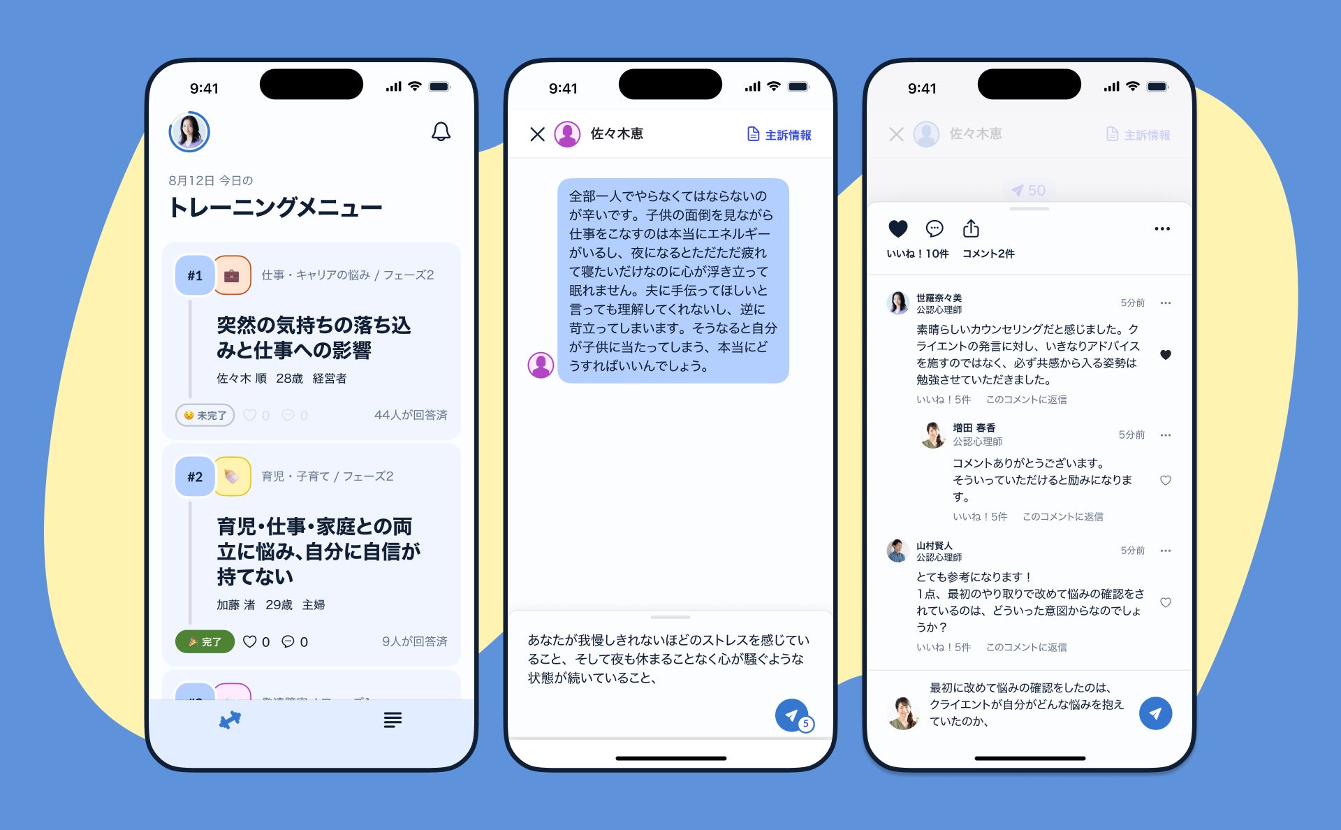 今後は「AIトレーニング(β)」機能を通してAIが学習した各カウンセラーの特徴データを用い、年内に個人に最適化された「カウンセラーの分身AI」の実装を目標としています。安価に提供できる分身AIにより利用ハードルを下げ、オンラインカウンセリングが特定のタイミングや一部の人が利用する”非日常的なもの”ではなく、生産性や活力の向上、リスクマネジメントとなるサービスを目指しています。