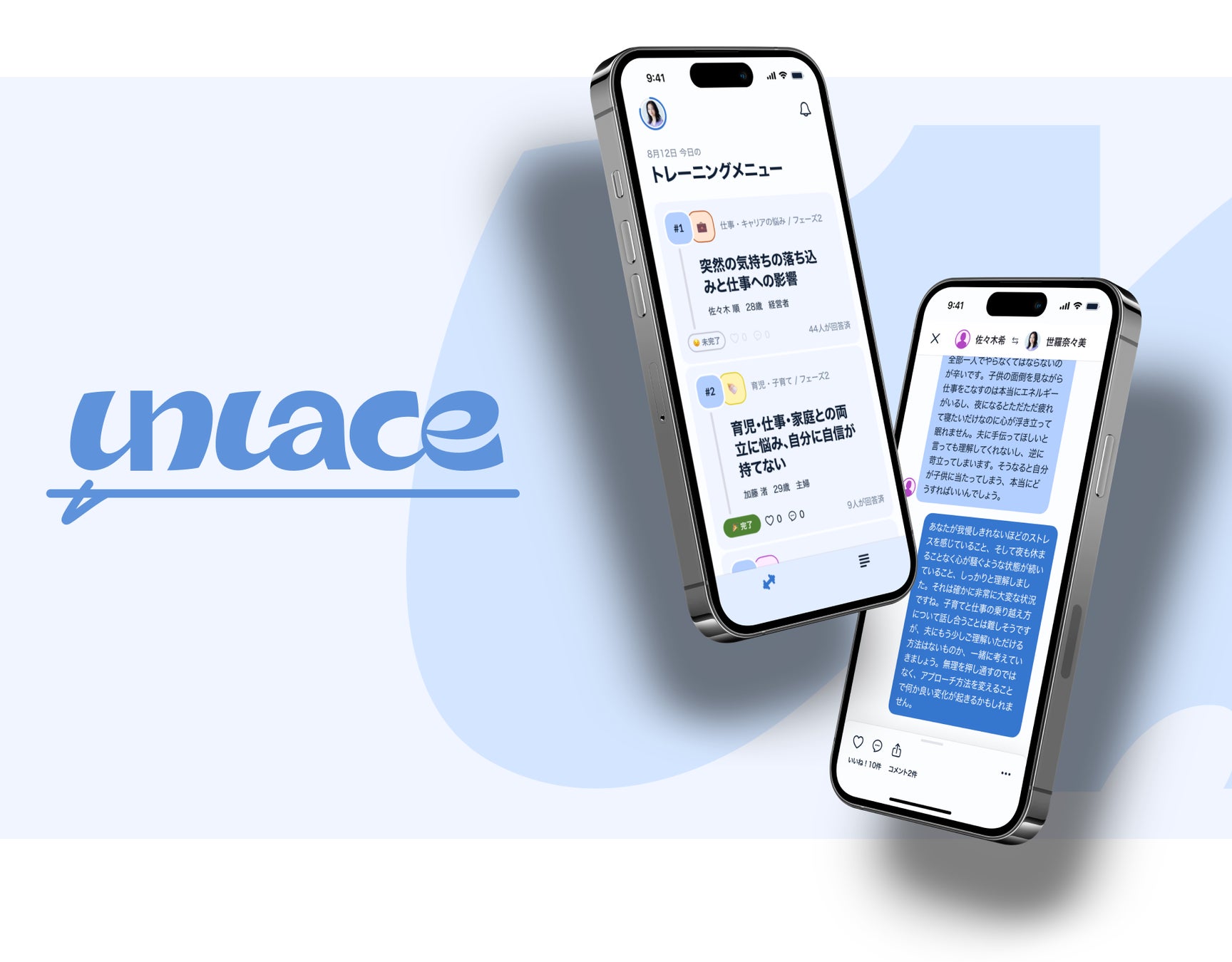 Unlaceは2020年12月からオンラインカウンセリングサービス「Unlace」をスタートさせてきました。この度のテクノロジー構想発表に合わせ、ブランドロゴの変更を含め、BI(ブランドアイデンティティ)を刷新いたしました。(制作kern inc.)