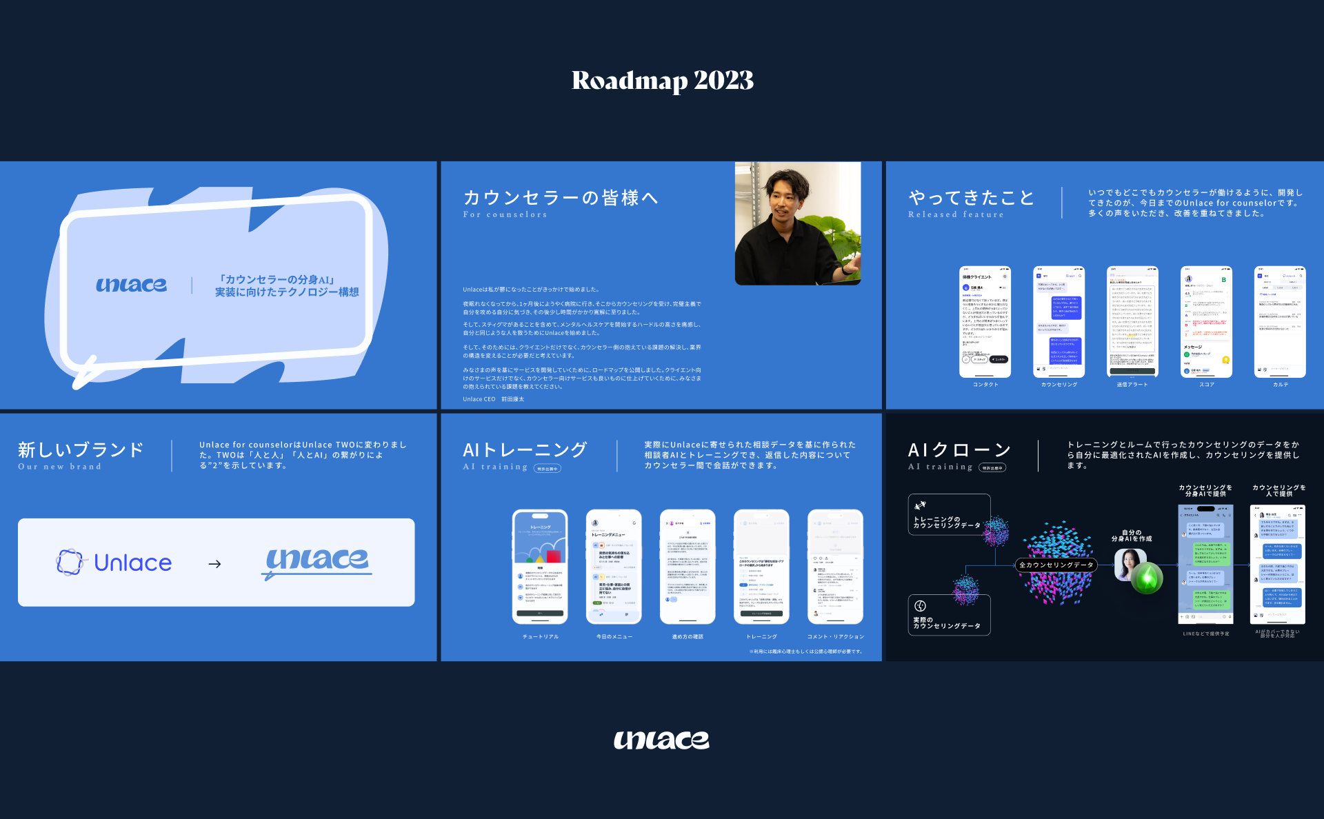Unlaceは全てをAIに委ねるのではなく、カウンセラーが役割を変えてAIと共存できるカウンセリングの未来を目指しています。従来の方法では解決できなかった課題へのアプローチや更なる改善、メンタルヘルス・ウェルネス業界の発展に向けて、引き続き開発を進めてまいります。