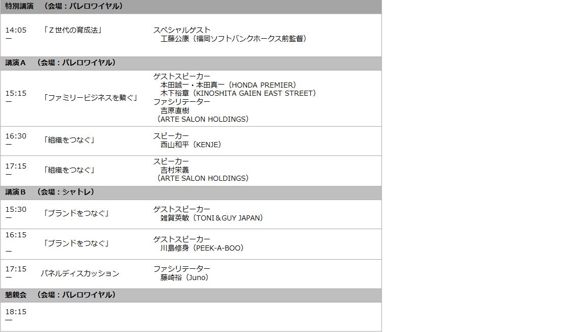 講演は、「親から子へ、子から孫へと繋ぐファミリービジネスとしての理美容室」、「創立者から選りすぐられた新しい経営者へと組織を繋ぐ理美容室」、「築き上げられた確固たるブランドというバトンを、スキルや技術に革新を起こしながら繋いでゆく組織」など、美容室業において果敢に行動し続けた方々の講演が行われます。