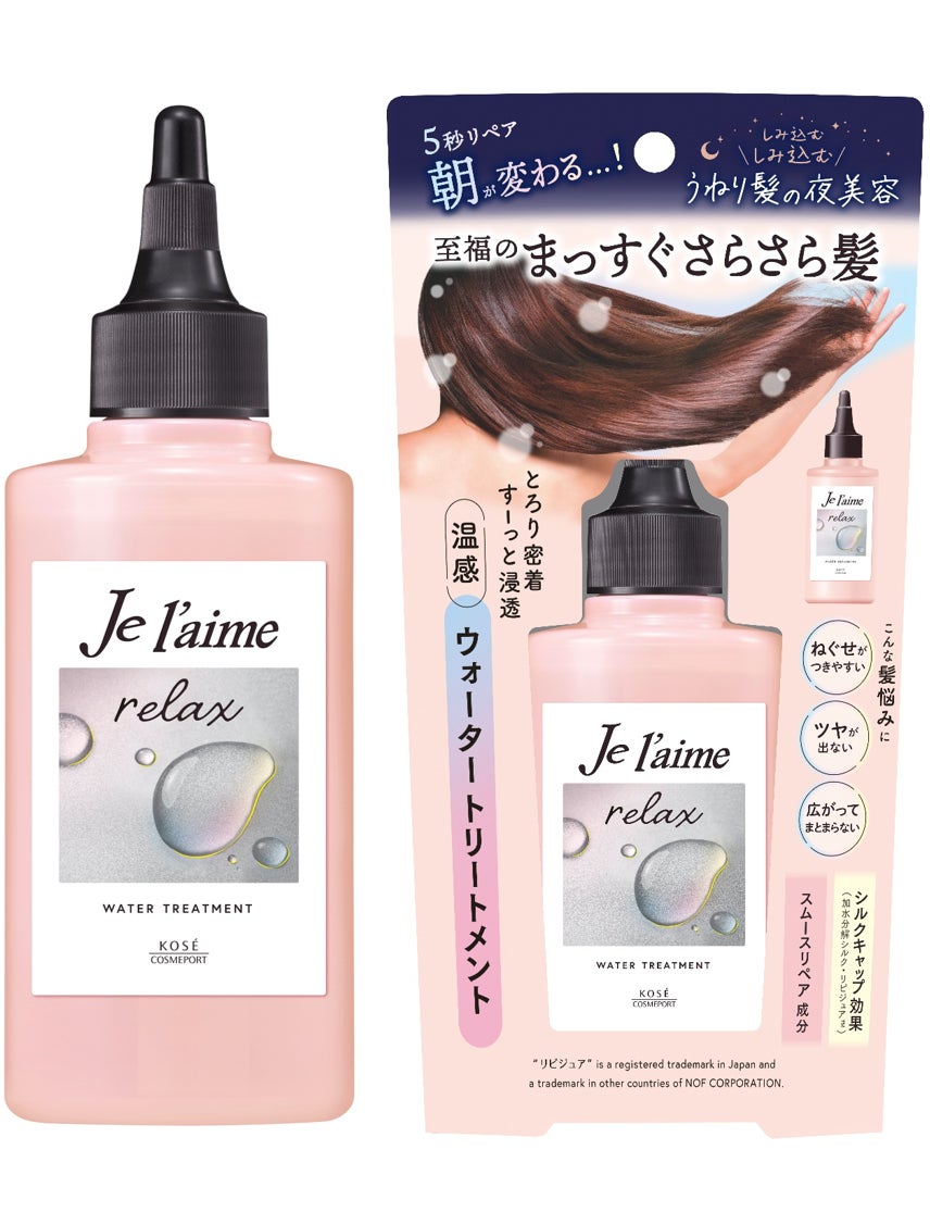 今回新たにシリーズに追加した「ウォータートリートメント」は、“朝が変わる 5秒リペア”をテーマにうねり髪ケアに特化した浸透型ウォータートリートメントです。うねりでまとまらない髪をまっすぐでまとまりのある至福のさらさら髪へと仕上げます。髪内部へ浸透しダメージ補修する成分として天然由来アミノ酸誘導体※2を配合。シャンプー後の濡れた髪に密着し、素早く浸透します。うねりの原因のひとつである“髪内部の水分バランスの乱れ”に着目し水分バランスケア成分※3とストレートコート成分※4を配合した「うねりコントール処方」を採用したことで、うねり髪を扱いやすいストレート髪に仕上げます。さらに、加水分解シルク・リピジュアTM※5配合で、毛髪をコーティングすることにより、寝ている間の乾燥や摩擦から髪をまもる「シルクキャップ効果」を発揮。カラーリングした髪の美しさを保つ「カラーケア処方」と、心地よい眠りに導くようなアロマティックジャスミンの香りも特長です。