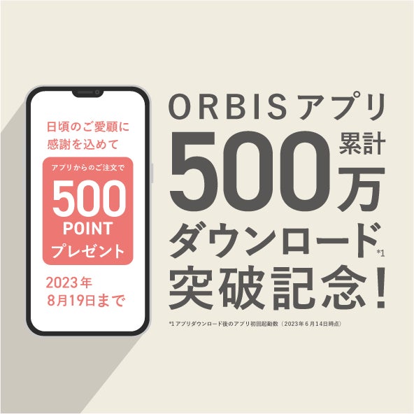 「ORBISアプリ」累計500万ダウンロードを記念して、2023年7月20日(木)より、「ORBISアプリ」で購入すると、500ポイント付与キャンペーンを開始します。(キャンペーン期間中おひとり様1回限り。サンプルのみのご注文の場合はキャンペーンの対象になりません。)