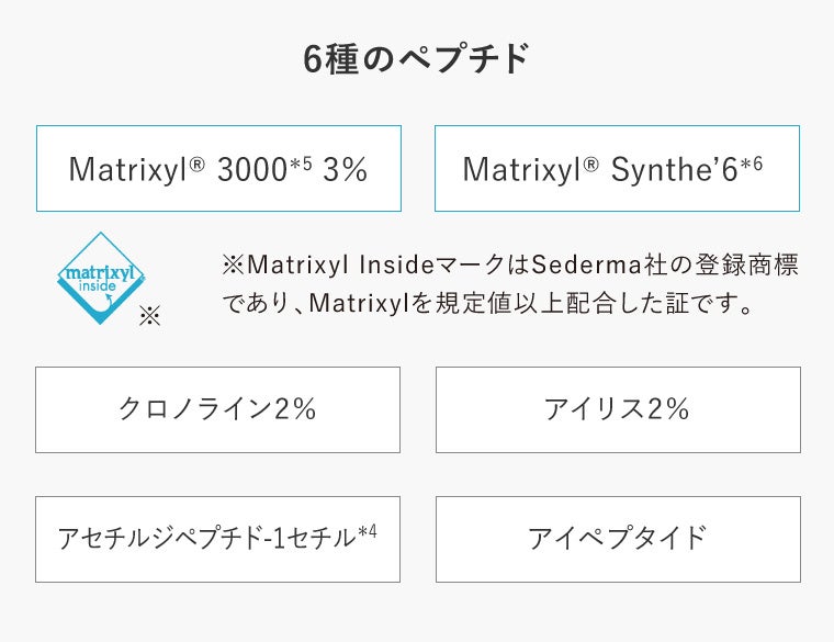 *1 当社比 *2 パルミトイルテトラペプチド-7、ジペプチド-2、ヘスペリジンメチルカルコン(整肌) *3 アセチルヘキサペプチド-8(整肌) *4 整肌 *5 パルミトイルテトラペプチド-7、パルミトイルトリペプチド-1(整肌) *6 パルミトイルトリペプチド-38(整肌)