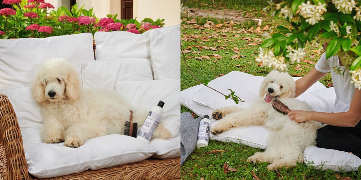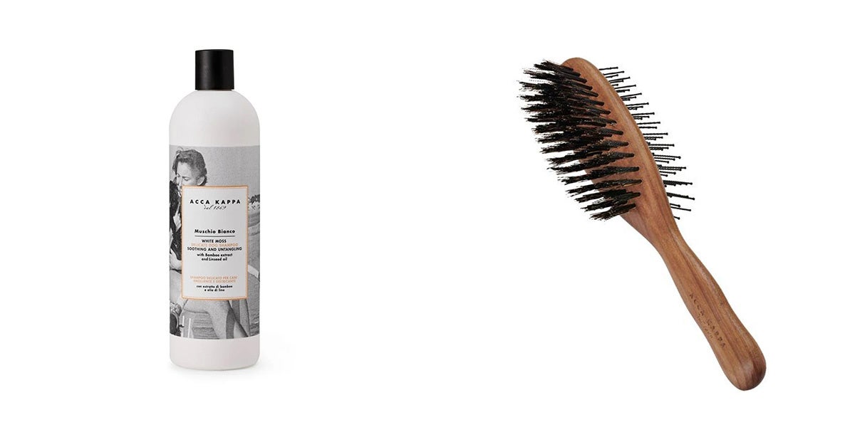 アッカカッパが愛犬の被毛の健康と美しさのために研究開発した、デリケートなホワイトモスの香りが心地よいケアシャンプーと、イタリア産クルミ材を贅沢に使った、特別デザインの手造り両面ブラシ。