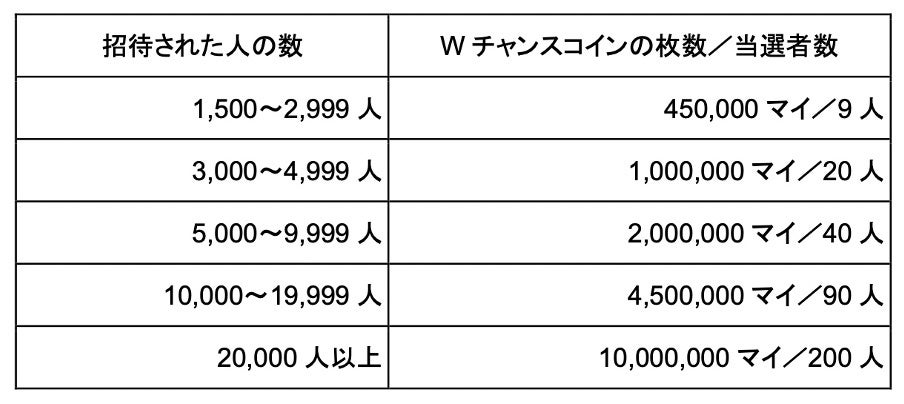 「アルコイン」をご利用のお客さまがお友だちやご家族などを招待していただき、招待された人が条件を満たすと、招待した人と招待された人それぞれにボーナスコインを100マイプレゼントします。さらに招待した人と招待された人の中から抽選で最大200人に最大で1,000万マイのWチャンスコインを山分けでプレゼントします。招待された人の数に応じて、Wチャンスコインの枚数と当選者数が段階的に増えます。なお、招待した人は、その相手の人数が多いほど当選確率が高くなります。