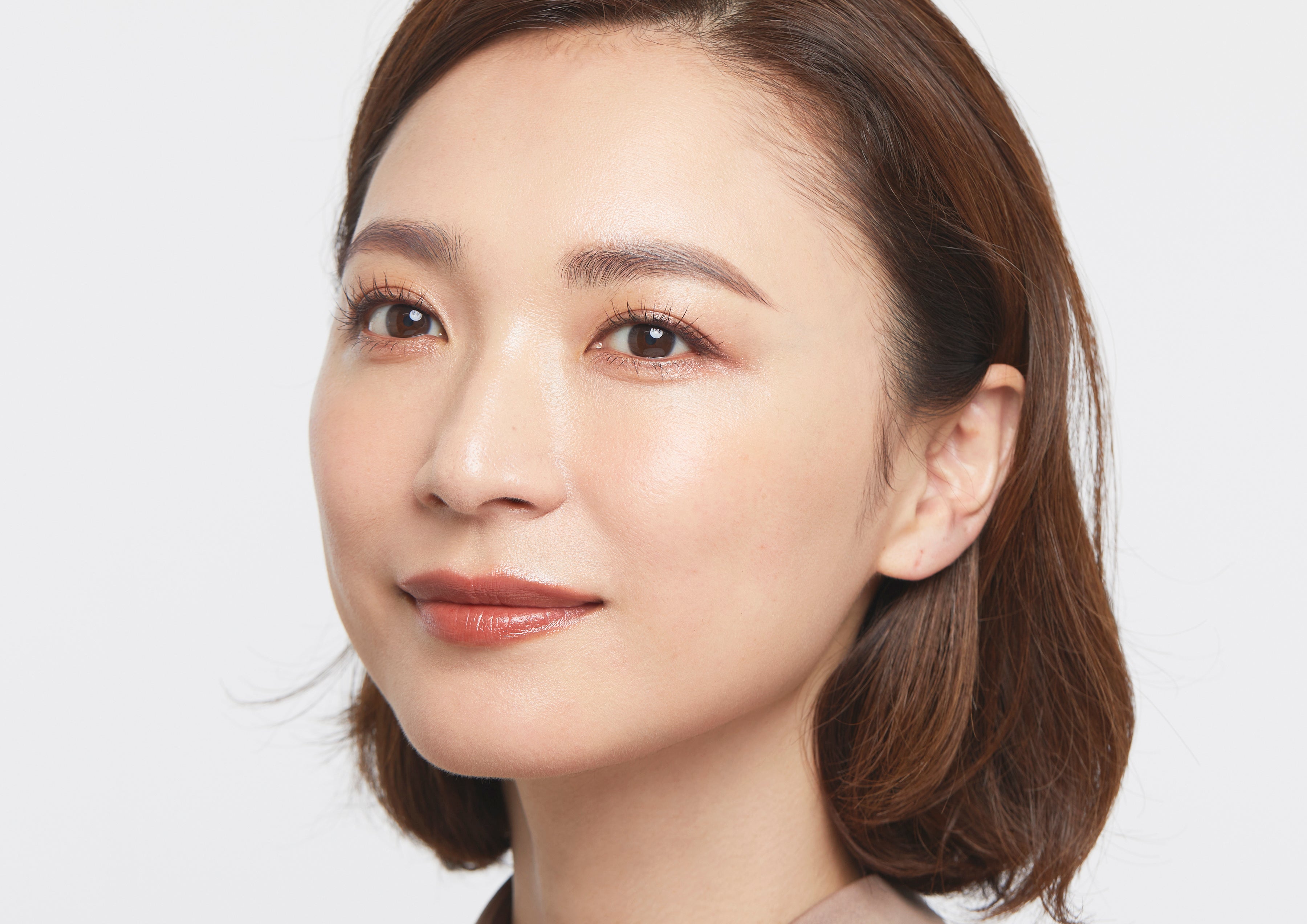 つやが出るタイプの下地とスキンケア成分配合ファンデーションを、それぞれほおや額の丸みを意識して顔の中央から外側に伸ばしていきます。フェイスパウダーはフェイスラインの引き締めて見せたいところに2度重ねづけをし、しっかりとつやを抑え、一方で、ハイライトを眉上、鼻根、ほおの高い位置などに使用することでつやを上乗せします。顔の中心部分と輪郭部分につやとマットの質感のコントラスをつけ、立体的に仕上げ、小顔に見せるテクニックです。