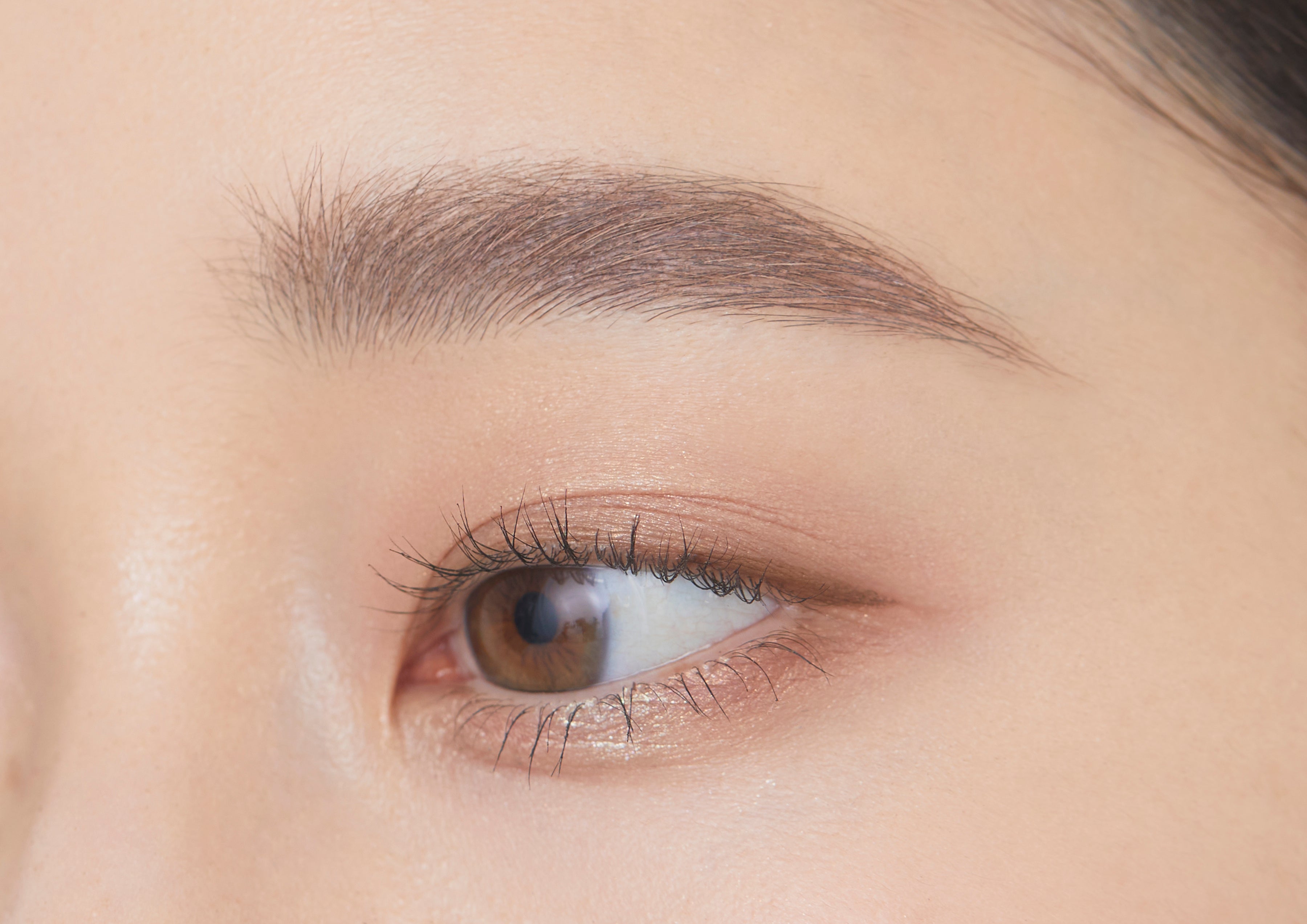 眉の存在感をふんわりと軽い印象にするため、眉毛が足りない所のみをペンシルで1本1本描き足し、仕上げに明るいベージュ系の眉マスカラを塗布します。