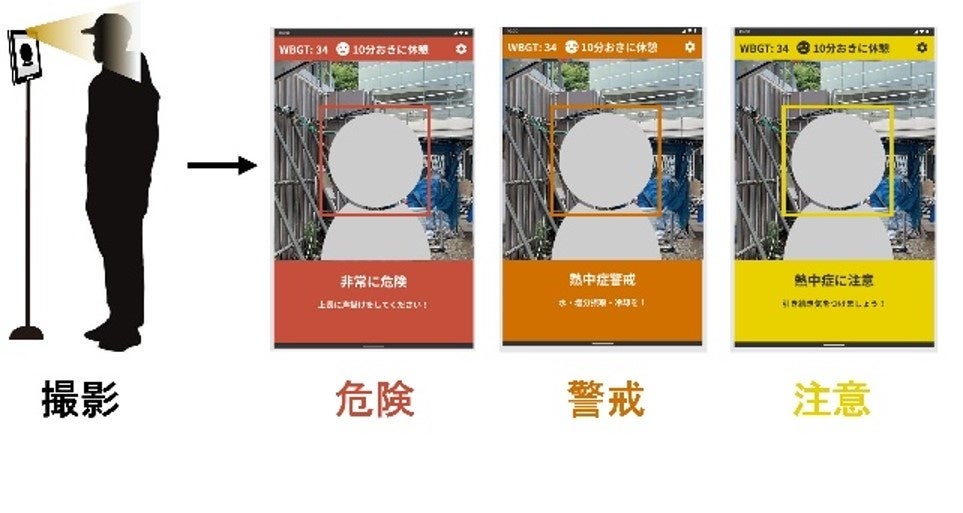 体調不良・朝食抜き・運動後疲労など生体内リスク要因を顔画像から割り出し、外気温・湿度など外的要因も統合し熱中症リスクを判定。結果は色やアラート音で作業者へ伝達。現場監督は、PCやスマートフォンで人員全体のリスク判定データを確認できる。