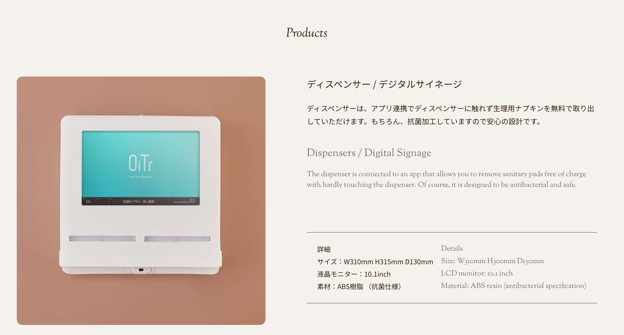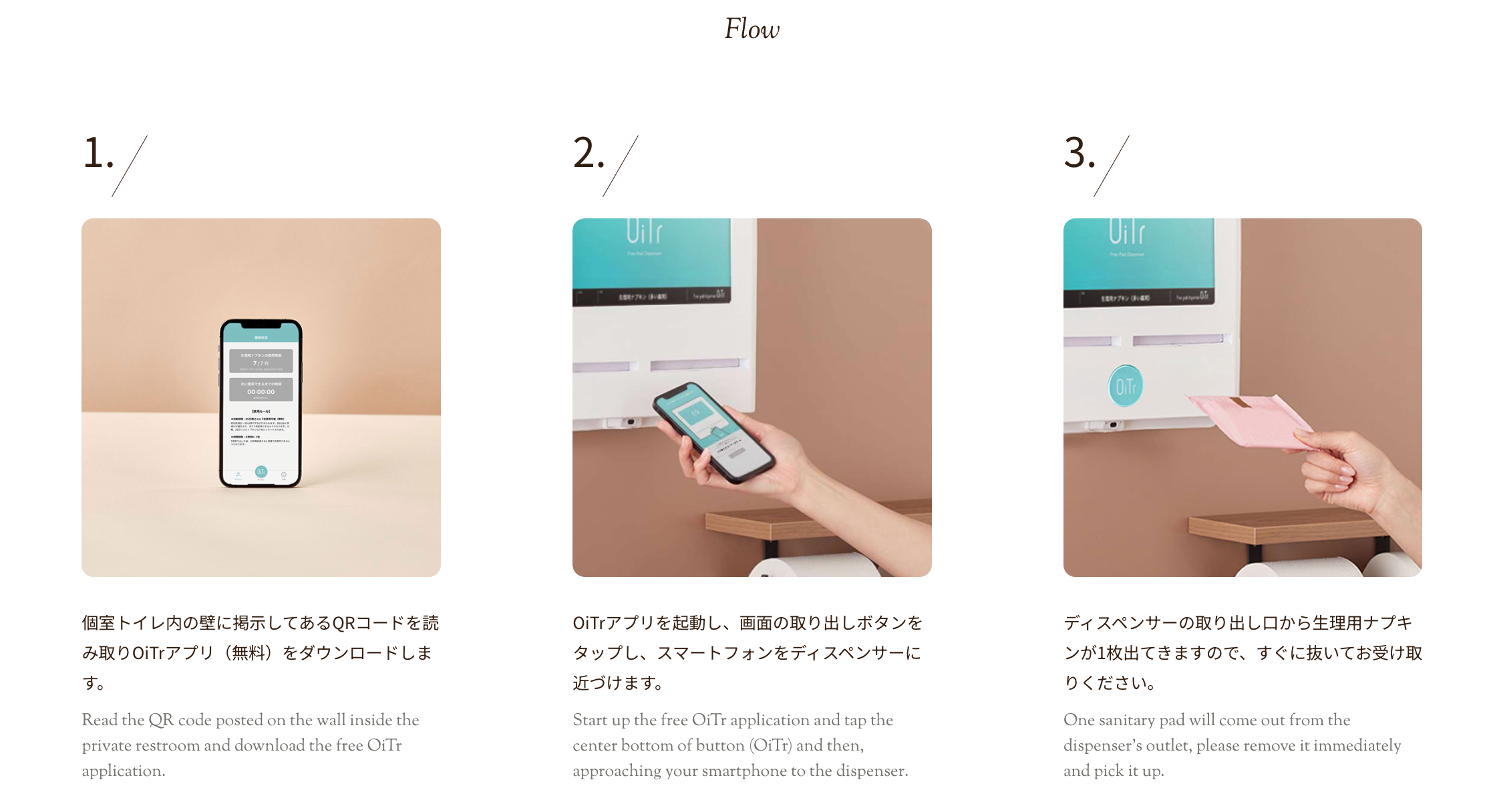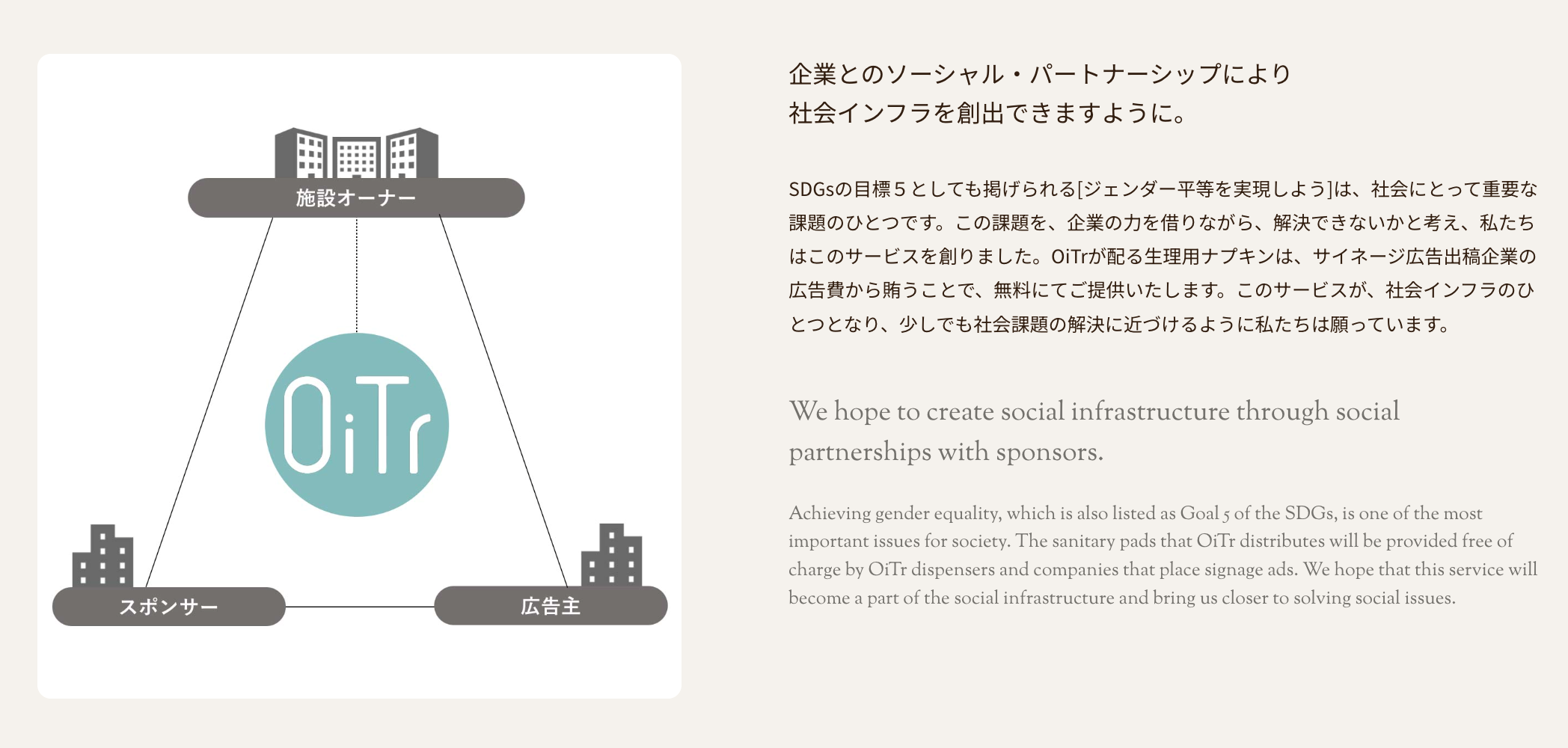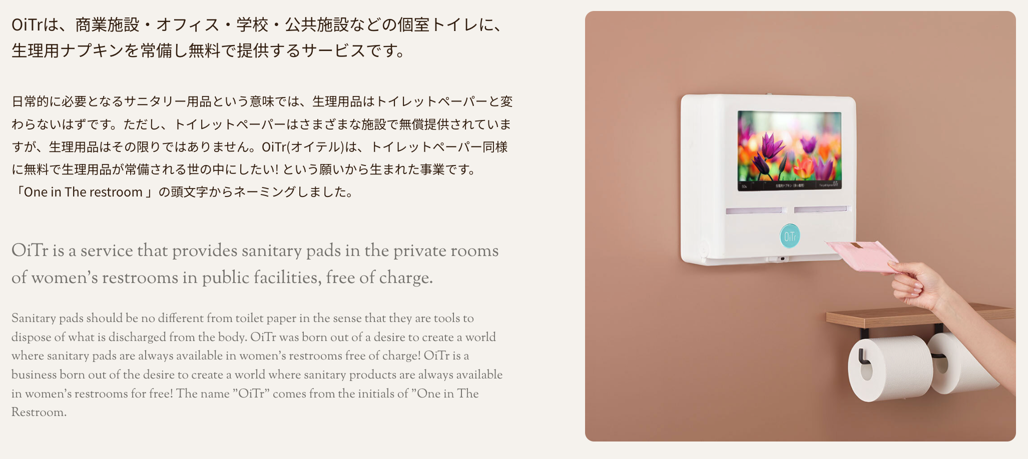 「あなたによくて、社会にいいこと」という理念のもと、生理(月経)のある人が強いられるさまざまな負担の軽減に役立ちたい、経済格差やジェンダーギャップといった不均衡の是正に寄与したい思いから、商業施設・交通機関・公共施設・学校・オフィスの個室トイレに、生理用ナプキンを常備し無料で提供するサービス「OiTr(オイテル)」を展開。