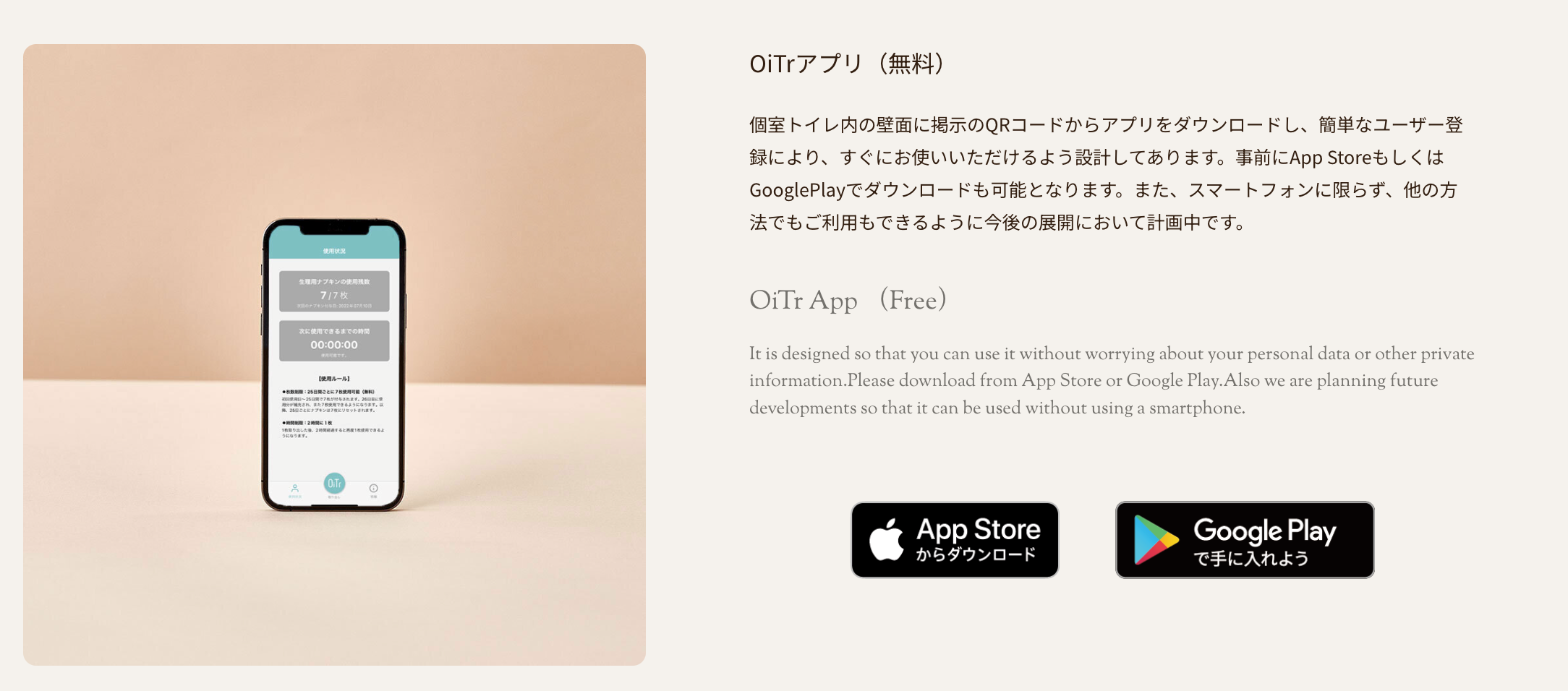 OiTr(オイテル)は、生理(月経)のある人が強いられるさまざまな負担を、幾分まかなえないかという思いから生まれた、商業施設・交通機関・学校・公共施設・オフィスなどの個室トイレに生理用ナプキンを常備し、無料で提供するサービスです。(特許第7064096号、特許第7075553号)