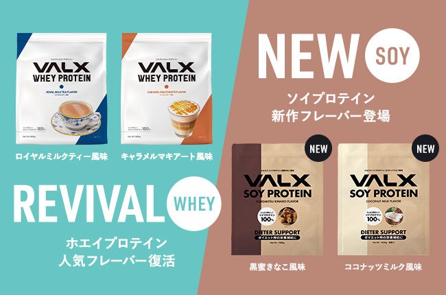 また、VALXソイプロテインからは、日本ならではのフレーバーで和を彷彿させる「黒蜜きなこ風味」と、まるで常夏のオアシスを連想させるかのような「ココナッツミルク風味」が新登場しました。