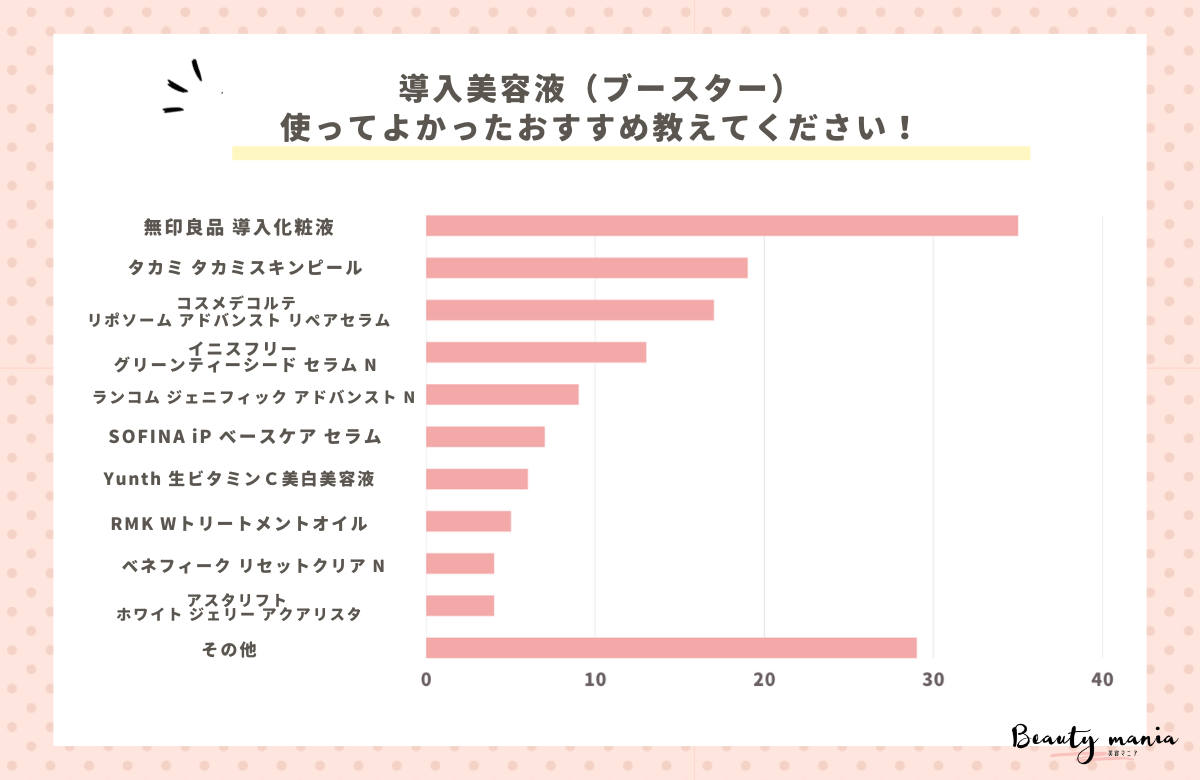 「導入美容液(ブースター)使ってよかったおすすめ教えてください!」とアンケート調査した結果、1位は『無印良品 導入化粧液(35人)』、2位は『タカミ タカミスキンピール(19人)』となっています。