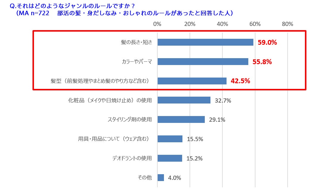 また、ルールのジャンルにおいては、髪の長さ・短さが59.0%と最も多く、カラーやパーマが55.8%、髪型が42.5%と上位3つが髪に関する内容でした。