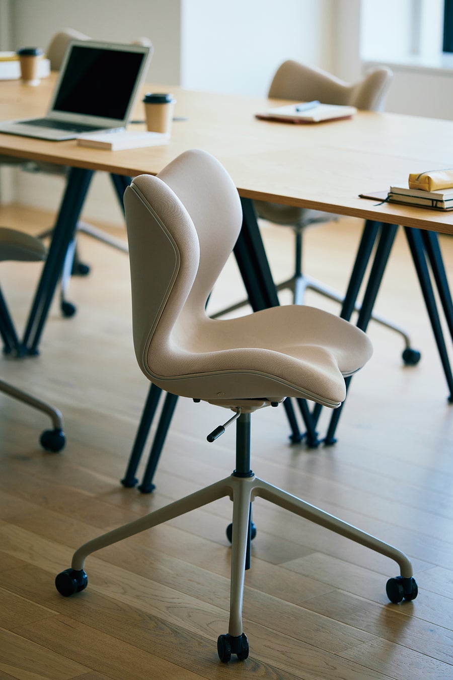 座面の高さ調整や回転機構、細身の4本脚キャスターなど、使い勝手を考えた機能を搭載。