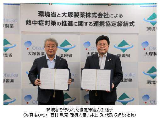 大塚製薬株式会社(本社:東京都、代表取締役社長:井上 眞、以下「大塚製薬」)と環境省は、熱中症に関する国民の予防行動の定着と地域における対策の更なる推進を図ることによって、熱中症による事故の減少を目的とした連携協定を7月24日に締結しました。