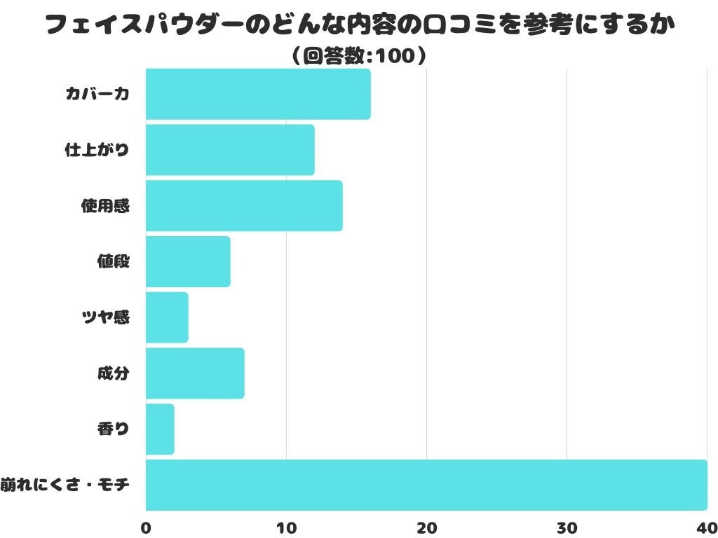 フェイスパウダーのどんな内容の口コミを参考にするかをアンケートにて調査したところ、1位は「崩れにくさ・モチ」でした。