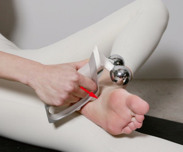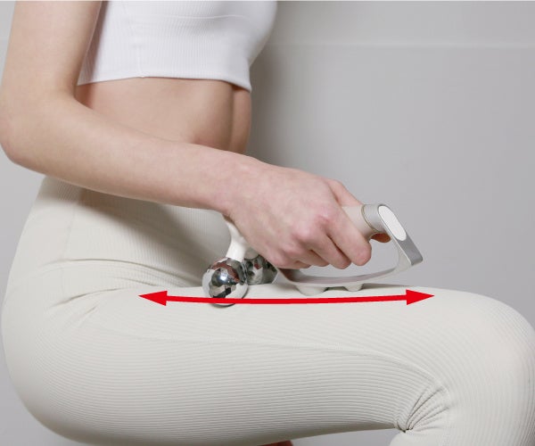 クールダウンで使用する際は、弧を描くように動かし、ローラー、突起部の順に肌に押し当てます。