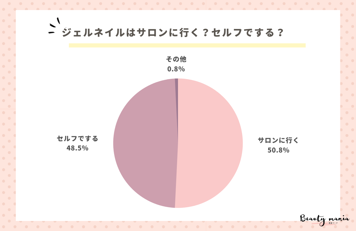 「ジェルネイルをする人、サロンに行きますか?セルフですか?」というテーマで130人にアンケートを行ったところ、「サロンに行く」と回答したのは全体の50.8%、ほぼ半数で分かれる結果となりました。