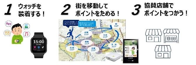 当事業では京都府精華町の住民約1500名を対象に心拍・ストレス・暑熱リスク・体調・歩数など利用者の健康状態が確認できるスマートウォッチ“MITSUFUJI 03”を配布し、スマートウォッチを装着しながらANA Xとミツフジが共同で開発したモバイルアプリサービス“03 Pocket”※4をインストールしたスマートフォンを携行して移動することにより、ポイントやマイルがたまります※5。たまったポイントは町内企業や店舗で利用する、またはANAのマイル※6等に交換することも可能です。スマートウォッチから取得したバイタルデータを元に、利用者に最適な健康行動のリコメンドがアプリに届きます。また町内に設置されたデジタルサイネージに、利用者の健康に基づいた商品やサービスなどのレコメンドが表示される予定です。利用者の日常の行動変容を促すことで、地域社会との関わり合いやコミュニケーションの機会等を増やし、心身の健康維持・健康増進・消費促進等につなげる自治体の新しい取り組みです。