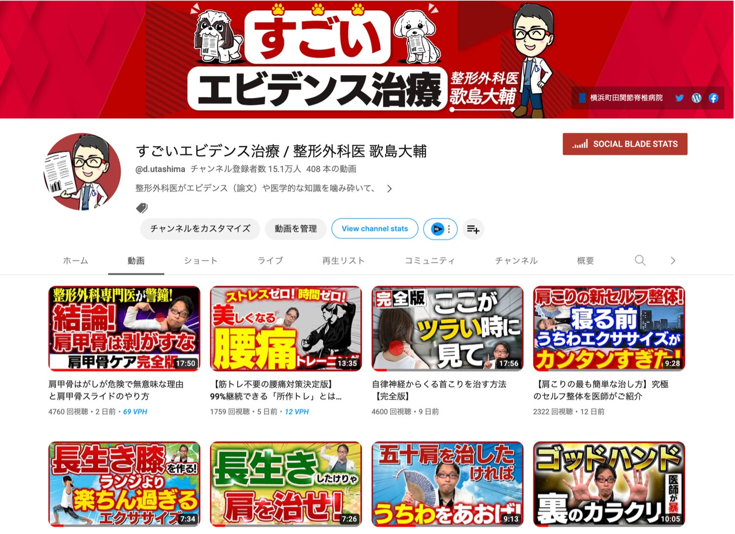 YouTube Ch.「すごいエビデンス治療 | 整形外科医 歌島大輔」登録者15万人突破