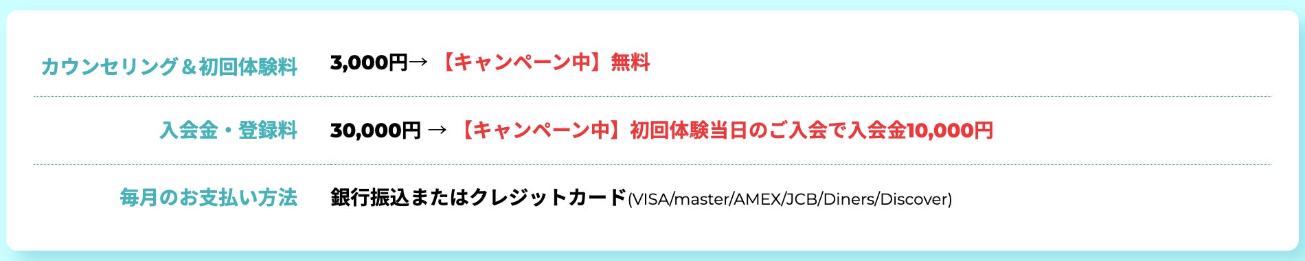 新店舗リリースを記念に、初回体験料無料、入会金2万円オフ、初月会費1万円オフの期間限定キャンペーンを実施中です。