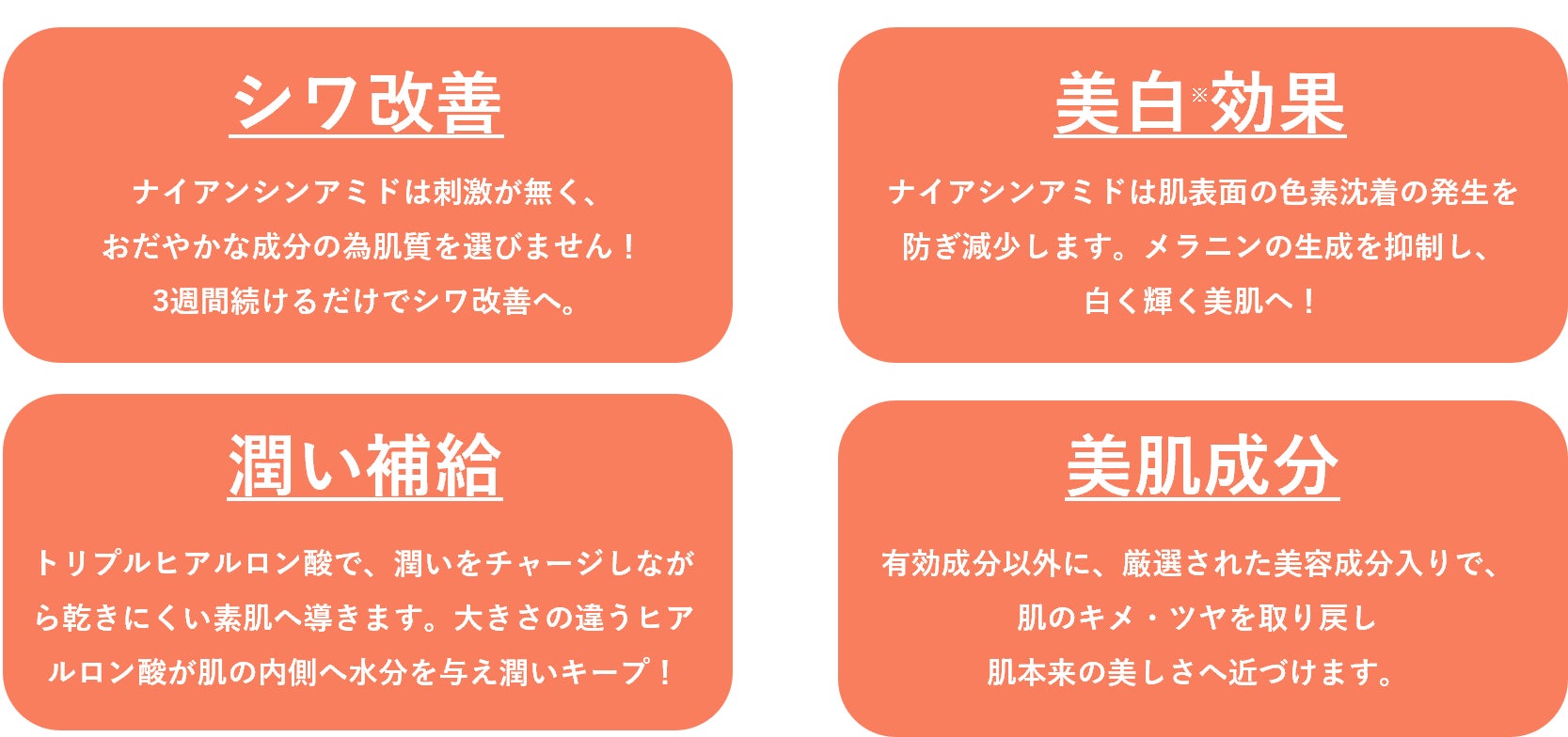 内側から押し上げ「ふっくら」シワの無い肌を作ると共に、透明感溢れる美白※肌へ。