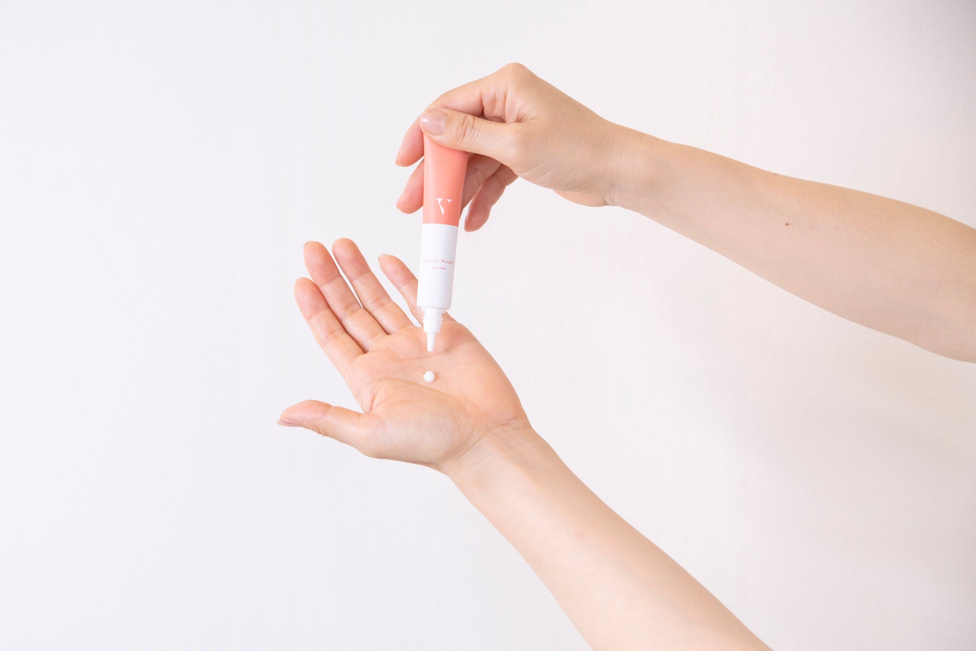 2.気になる部位(目元・口元・額・首元等)1カ所につき、パール粒小1個分のクリームを手に取ります。