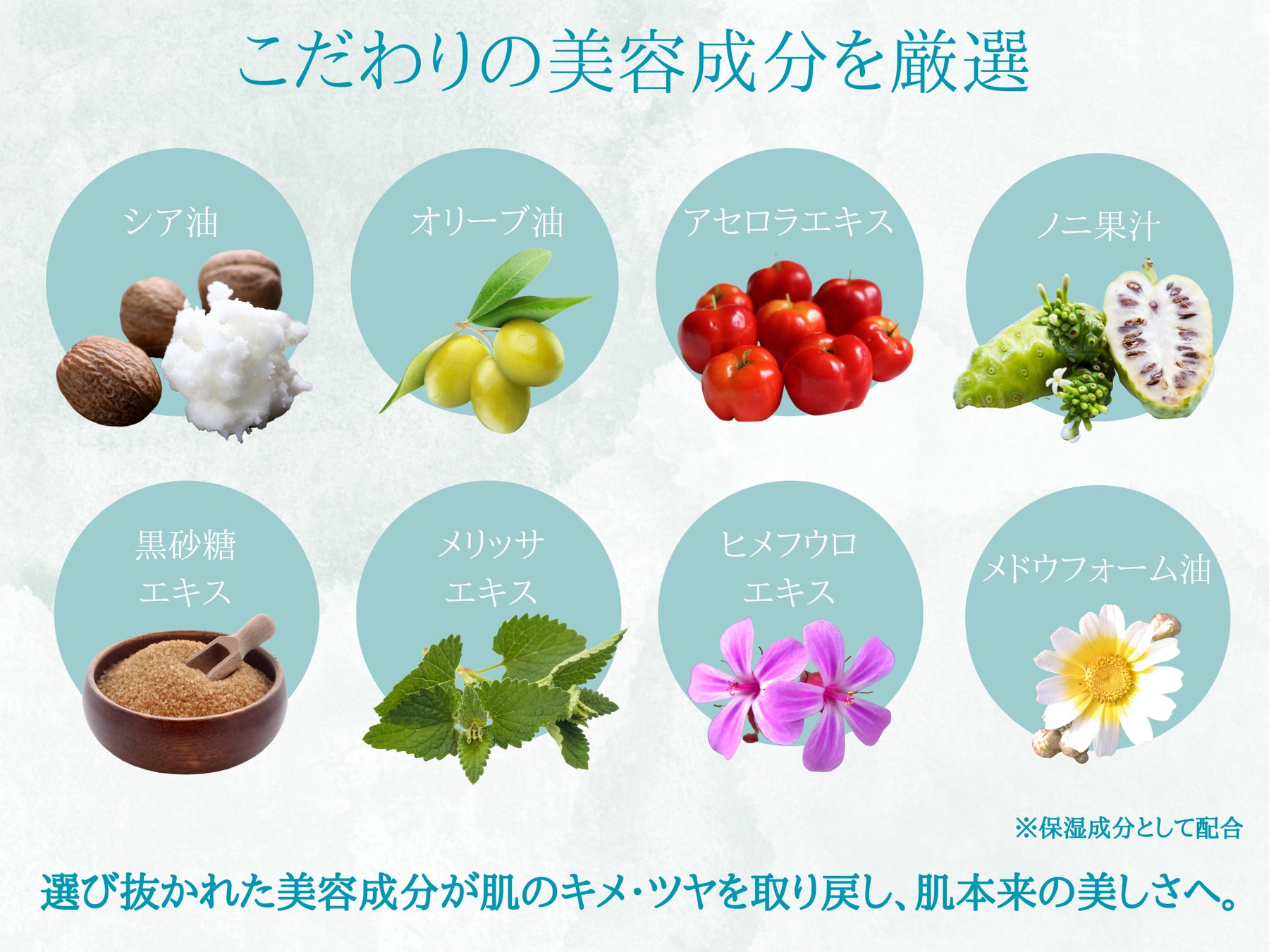 その他の成分: マルトース・ショ糖縮合物、シア脂、オリブ油、ノニ果汁、ステアロイルフィトスフィンゴシン、アセチル化ヒアルロン酸ナトリウム、ヒアルロン酸Na-2 、加水分解ヒアルロン酸、海藻エキス-1、アセロラエキス、水ナス果実エキス、黒砂糖エキス、コラーゲン・トリペプチド F 、ヒメフウロエキス、メリッサエキス、オウゴンエキス、サクシニルアテロコラーゲン液、セイヨウハッカエキス、BG、シュガースクワラン、植物性スクワラン、濃グリセリン、グリセリン、ステアリン酸ポリグリセリル、 メドウフォーム油、親油型ステアリン酸グリセリル、トリエチルヘキサン酸グリセリル、ステアリルアルコール、ジメチコン、ラウロイルグルタミン酸ジ(フィトステリル・オクチルドデシル)、カルボキシビニルポリマー、キサンタンガム、水酸化K、天然ビタミンE、ジエチレントリアミン5酢酸5Na液、1,2-ペンタンジオール、フェノキシエタノール、精製水