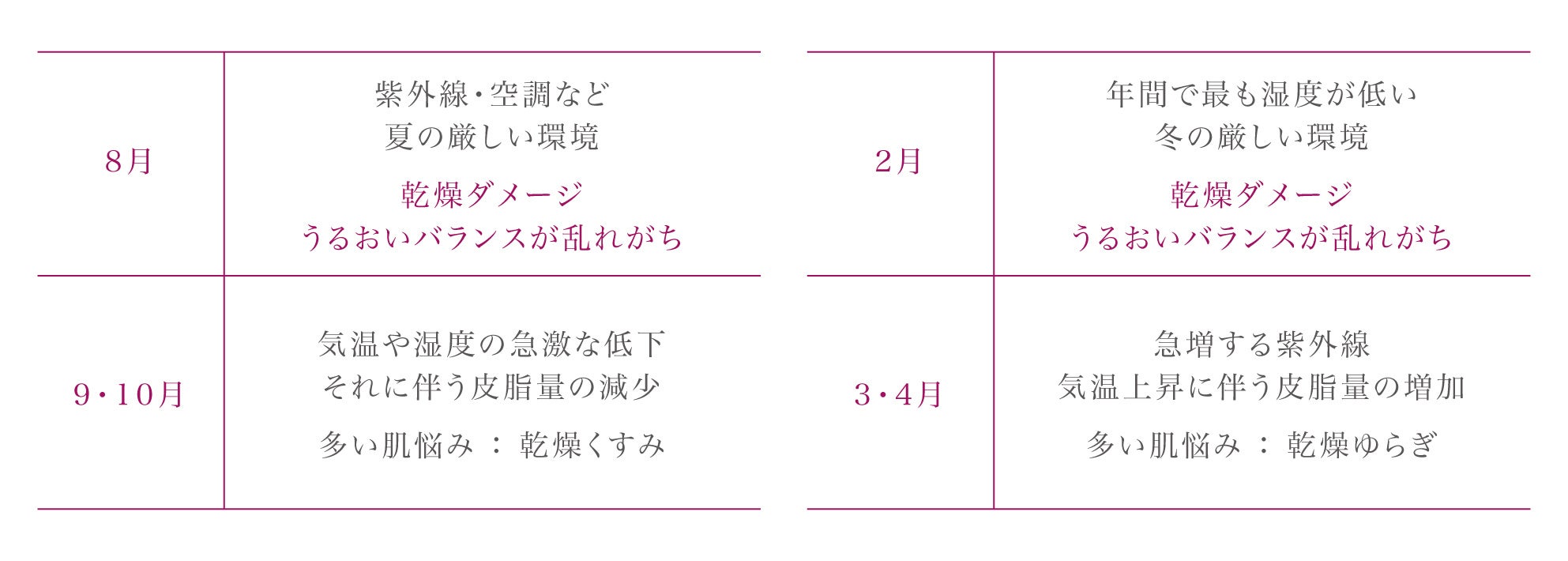 夏から秋へ向かう8月と冬から春へ向かう2月の季節の変わりめは、気温や湿度、紫外線量など外部環境の変化が起こりやすく、その影響を受けることで肌のうるおいバランスが乱れがちになります。